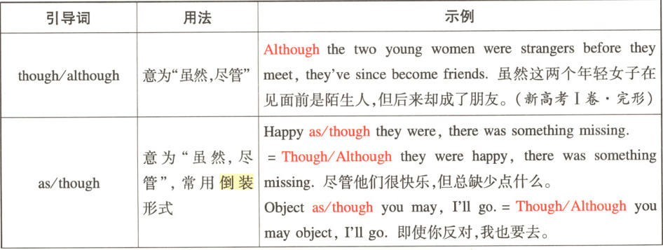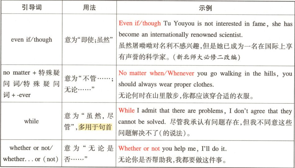 在主从复合句中作让步状语的从句称为让步状语从句。常见的引导词有 though、although、even if/though、no matter + 特殊疑问词/特殊疑问词 + -ever、while、as、whether or not/whether...or(not)等。