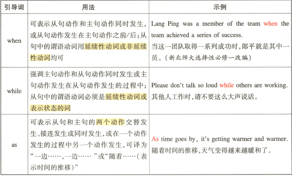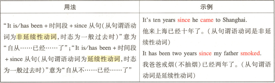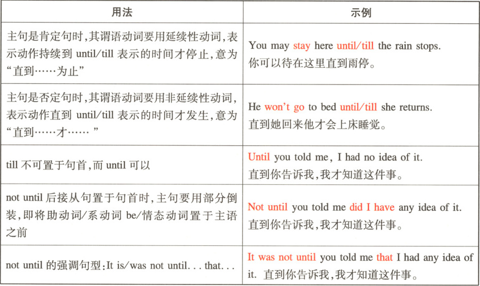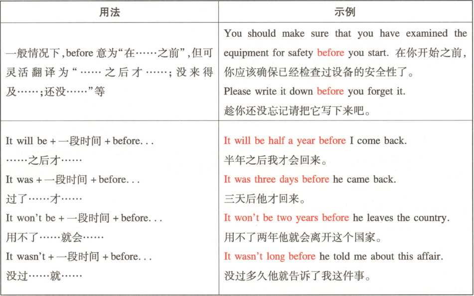 (8)by the time 意为“到……的时候”,在句中常起连词作用,引导时间状语从句。如果从句是一般过去时,主句常用过去完成时;如果从句是一般现在时(表示将来),主句常用将来完成时。