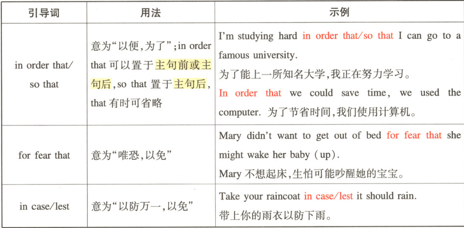 在主从复合句中作目的状语的从句称为目的状语从句。目的状语从句一般置于句尾,谓语常含有情态动词。常见的引导词有 so that、in order that、for fear that、in case、lest 等。