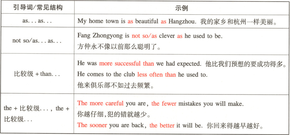 在主从复合句中作比较状语的从句称为比较状语从句。比较状语从句通常置于句尾。常见的引导词有 as...as...、not so/as...as...、than 等。