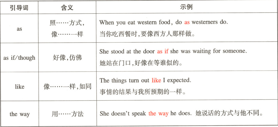 在主从复合句中作方式状语的从句称为方式状语从句。常见的引导词有 as、as if/though、like、the way 等。