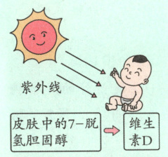 答案:日光中的紫外线可使皮肤中的7-脱氢胆固醇转化为维生素D,维生素D可促进人肠道对钙、磷的吸收,从而促使骨骼正常发育。
