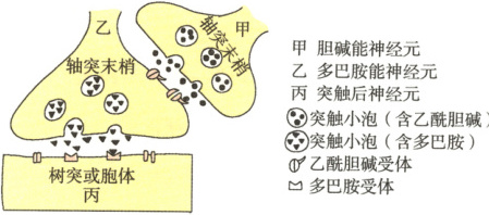 例3(广东卷)研究多巴胺的合成和释放机制,可为帕金森病(老年人多发性神经系统疾病)的防治提供实验依据,最近研究发现在小鼠体内多巴胺的释放可受乙酰胆碱调控,该调控方式通过神经元之间的突触联系来实现(如图)。