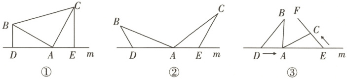 24. (12分)新考向 探究题(唐山期中)已知在$\triangle ABC$中,$AB=AC$,$D,A,E$三点都在直线$m$上,且$DE=9cm$,$\angle BDA=\angle AEC=\angle BAC$.