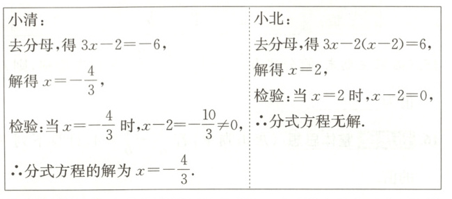 19. (8分)(沧州期末)下面是小清与小北两位同学解分式方程$\frac{3x}{x - 2} - 2 = \frac{6}{2 - x}$的过程.