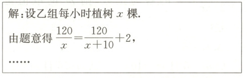 9. (邯郸期中)甲、乙两组同学在植树活动中均植树 $ 120 $ 棵,已知 ______,求乙组每小时植树多少棵.下面是题目的部分解题过程,则横线上缺少的条件为( )