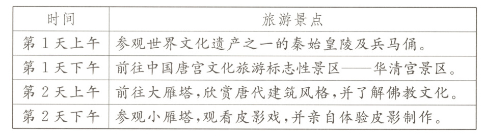 【解析】本题考查学生的语言表达能力。完成本题时,可根据“西安旅游指南”中旅游景点的介绍,概括出两条,用恰当的语句写出来。