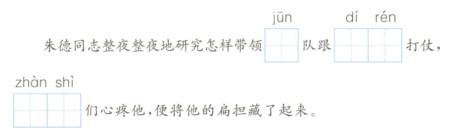 【解析】本题考查学生根据拼音书写字词的能力。在熟练掌握本课字词的基础上,认真书写字词。注意“军队”的“军”不要写成“君”,“战士”的“士”不要写成“土”。