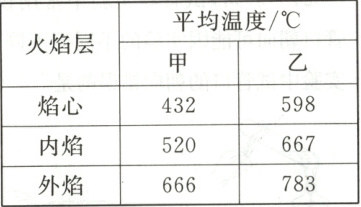 甲、乙两位同学在老师指导下,分别利用温度传感器测得酒精灯各层火焰平均温度如表。