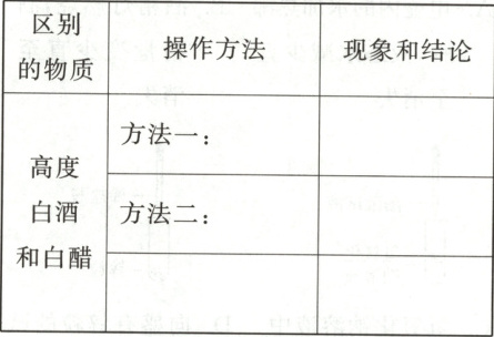 9. 在你的家庭中一般都有高度的饮用白酒和作为调味品的白醋,假设它们都失去了标签,根据你的生活经验或知道的化学知识,请你至少用两种不同的方法把它们区别开。(写出操作方法、现象和结论)