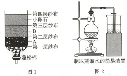 (1) 如图 1 所示是用空塑料饮料瓶、带导管的单孔胶塞、蓬松棉、纱布、活性炭、小卵石、石英砂等材料自制的一个简易净水器。根据上述净化材料的特性,B 层放置的材料最好是