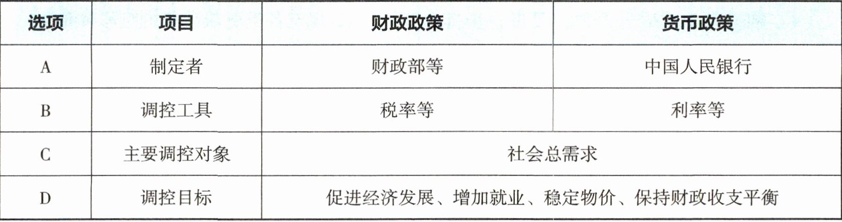 20. 小杨同学列表比较了财政政策与货币政策的异同。其中存在错误的是()