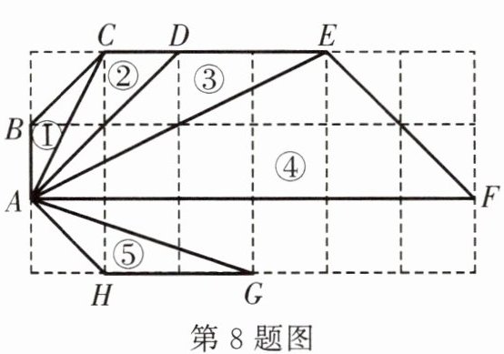 8. 如图,在正方形网格中有$5$个格点三角形,分别是①$\triangle ABC$,②$\triangle ACD$,③$\triangle ADE$,④$\triangle AEF$,⑤$\triangle AGH$. 其中与⑤相似的三角形是( )