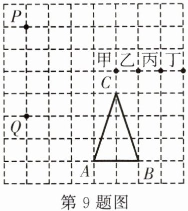 9. 如图,$A$,$B$,$C$,$P$,$Q$,甲、乙、丙、丁都是方格纸中的格点. 为使$\triangle PQR \backsim \triangle ABC$,点$R$应是甲、乙、丙、丁四点中的________.