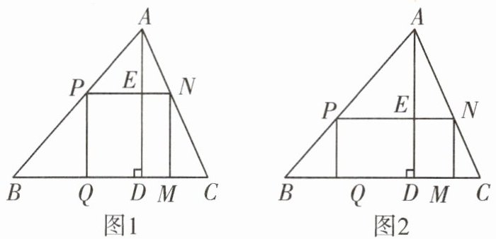 (2) 如图2,把它加工成矩形零件,使矩形的一边在$BC$上,其余两个顶点分别在$AB$,$AC$上. 若这个矩形的边$PN:PQ = 2:1$,则这个矩形的长、宽各是多少?