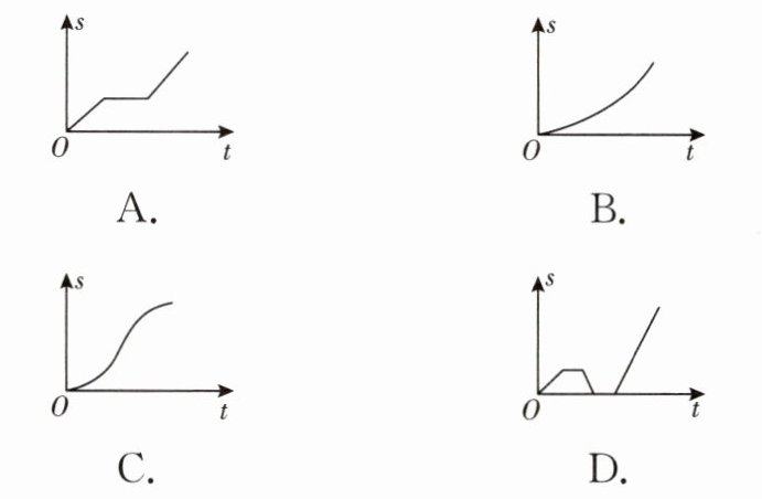 6. 某天早上,小明骑车上学,出发时感到时间较紧张,然后加速前进,后来发现时间还比较充裕,于是放慢了速度。记出发后经过的时间为 $ t $,离开家的距离为 $ s $,则下列图象中,与以上事件吻合得最好的是( )