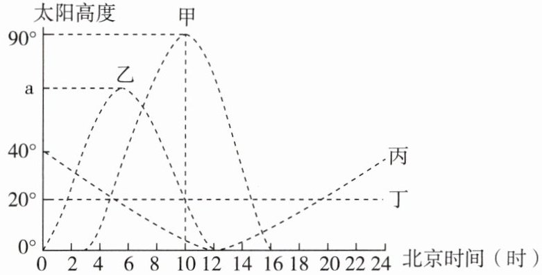 9. B 【解析】据图可知,乙地在北京时间6时太阳高度达最大值,说明此时该地地方时为12时,比北京时间(120°E地方时)早6小时,因此乙地的经度为150°W,C、D错误。丁地太阳高度24小时之内没有变化,说明为极点。极点处太阳高度为20°,说明太阳直射点的纬度为20°,乙地昼长为12小时,昼夜平分,位于赤道,因此乙地正午太阳高度为70°,即a为70°,A错误,B正确。