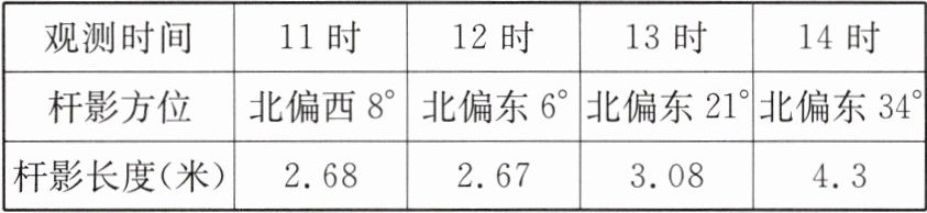 (2025·舟山高二期末)我国甲城市某中学地理兴趣小组开展“立杆见影”实践活动。下表为该小组在冬至日北京时间11时—14时逐小时观测并记录的直立杆(杆长1米)杆影方位和长度数据。据此完成第15、16题。