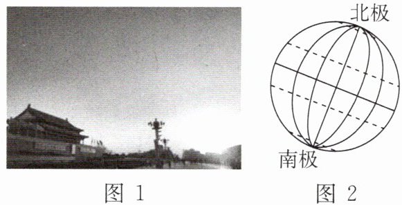 材料一 小华于国庆节期间来到北京天安门广场参观游览。图1为她拍摄的照片。图2为地球经纬网示意图。