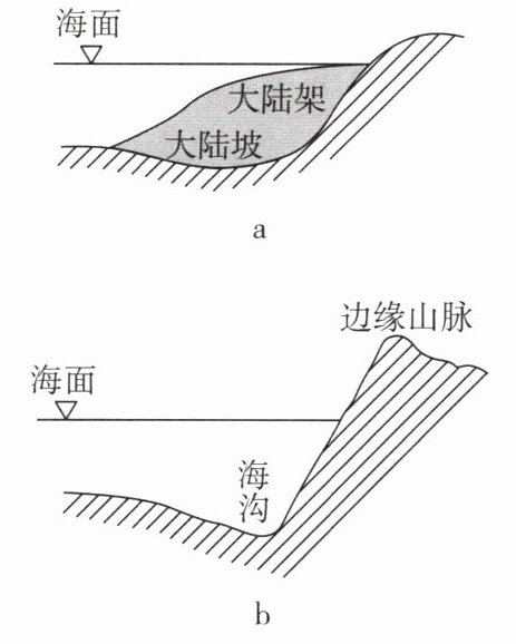 14.A 【解析】我国东海岸大陆架面积广阔,属于a类大陆边缘,A正确;墨西哥西海岸形成边缘山脉,属于b类大陆边缘,B错误;新西兰东海岸、菲律宾东海岸有岛弧形成,属于c类大陆边缘,C、D错误。 15.C 【解析】图中b类大陆边缘类型中的边缘山脉是由大陆板块和大洋板块挤压碰撞形成的,由边缘山脉、海沟组成。安第斯山脉位于美洲板块与小板块的消亡边界,板块之间相互挤压碰撞形成边缘山脉,C正确。阿特拉斯山脉是非洲板块和欧亚板块挤压碰撞形成的,为陆陆板块碰撞,A错误。西高止山脉位于印度洋板块内部,B错误。斯堪的纳维亚山脉位于欧亚板块内部,D错误。
