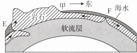 12.A 【解析】据图可知,E处为大洋板块和大陆板块的碰撞挤压地带,属于消亡边界,A正确;据图中F处附近的箭头可判断,其两侧板块之间逐渐分裂,因此F处为生长边界,处于板块的张裂地带,岩浆喷出冷凝堆积后形成海岭,不会形成海沟,B错误;F处位于海岭处,是新的大洋地壳的诞生地,岩石年龄较E处新,C错误;板块与板块的交界地带,地壳运动比较活跃,E处位于板块的消亡边界,F处位于板块的生长边界,E、F处均为板块交界地带,F处地壳运动不一定较E处活跃,D错误。 13.D 【解析】板块的边界有消亡边界和生长边界两种,美洲板块的大陆西部边缘为消亡边界,而东侧大西洋中为生长边界,该特点与图中甲板块的情况相同,D正确;印度洋板块西侧是非洲板块,两大板块之间是生长边界,与图示不符,A错误;欧亚板块西侧是美洲板块,两大板块之间是生长边界,与图示不符,B错误;南极洲板块周围板块边界不符合图示情况,C错误。