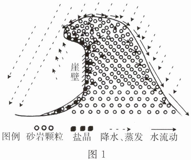 盐风化是岩石表面的盐分随着降水渗入岩石孔隙(或裂隙)中,向岩石背风面运动,在干燥的背风面结晶、膨胀,导致岩石背风面崩裂,在岩石表面形成坑坑洼洼的风化穴,这种风化作用多见于沿海和内陆干旱地区的近地面岩石中。图 1 为盐风化原理示意图,图 2 为崖壁盐风化穴景观图。据此完成第 4、5 题。