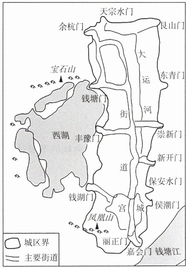 南宋都城临安城,依山傍水,河流穿城而过,南宫北市,南北狭长,形似“腰鼓”,其选址与布局体现了与地形、水文、气候等自然要素的高度融合。如图所示为南宋临安城位置及布局示意图。据此完成第1、2题。