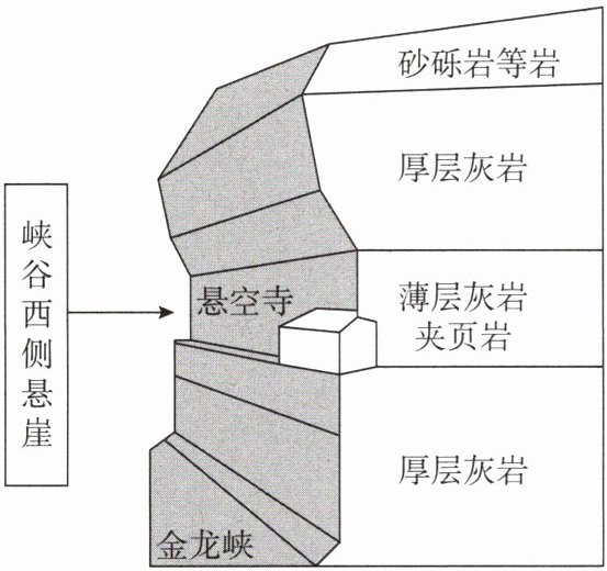 (2024·湖州高二期中)悬空寺位于山西省恒山(39°42'N,113°41'E)的金龙峡谷(峡谷呈南北走向)的西岸崖壁。古时人们在峭壁上修建了栈道,后世以此为依托建起悬空寺。悬空寺“日晒不着、雨淋不着、风吹不着、千年不倒”。始建初期,悬空寺距离谷底近百米,后来与谷底距离越来越近。如图所示为悬空寺位置示意图。据此完成第8、9题。