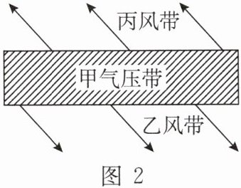 图1为沿某经线的大气运动示意图,图2为图1中甲气压带及其南北两侧风带的风向图。据此完成第12—14题。