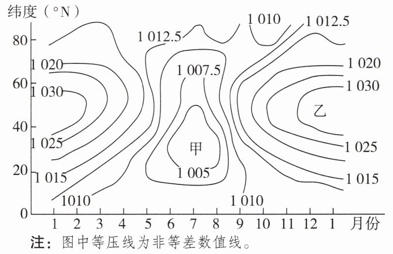 (2024·浙江6月选考)亚洲的天气、气候与气压场的分布及变化直接相关。如图所示为沿100°E海平面气压(单位:hPa)年变化图。据此完成第15、16题。