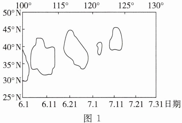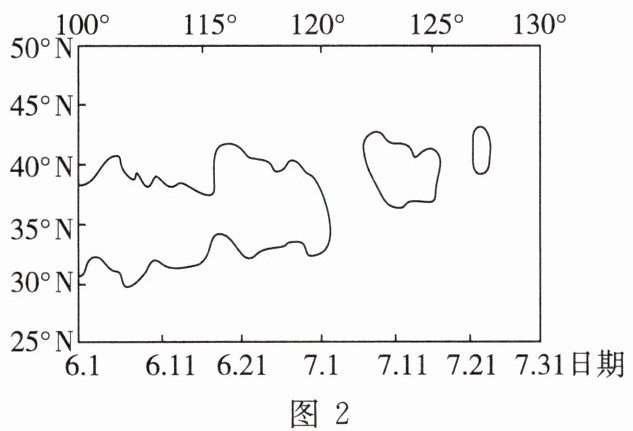 (2024·丽水高二上期末)西风急流是指西风带强西风中心区,性质冷湿,其位置年内不同。夏季东亚西风急流位置的变化会对影响我国的夏季风和太平洋副高位置产生影响,继而导致夏季风和副高对我国的影响程度发生变化。图1、图2分别为不同年份6—7月东亚西风急流(实线区域)沿100°E—130°E位置变化示意图。据此完成第19、20题。
