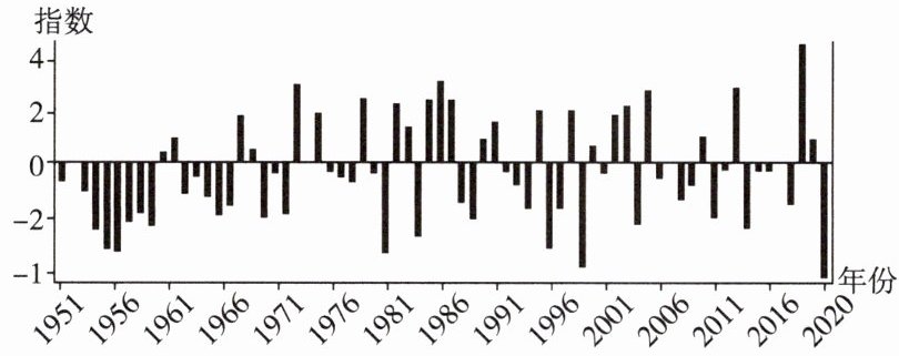 季风指数是指某一地区季风现象明显程度的数值,季风指数愈大,季风现象愈明显。夏季风指数与我国不同区域的降水总量有显著关系。例如,夏季风指数与夏季长江中下游和淮河流域降水有显著的相反关系。研究发现,在强烈的夏季风年,西北太平洋副热带高压西伸弱,位置偏东,南亚高压东扩弱,位置偏西,两高压纬向位置多为分离状态,导致长江流域水汽主要来自北印度洋的西南风通道,降水偏少。如图所示为1951—2020年我国副热带地区夏季风指数逐年变化统计图。
