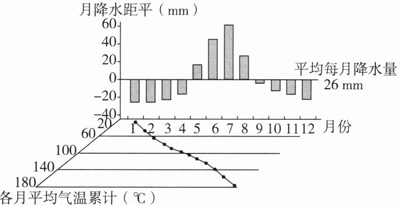 如图所示为世界某地区气候资料图(平均每月降水量=年平均降水量 $÷ 12$,月降水距平=当月多年平均降水量—平均每月降水量,月平均气温累计=当月月平均气温+上月平均气温累计)。据此完成第16、17题。