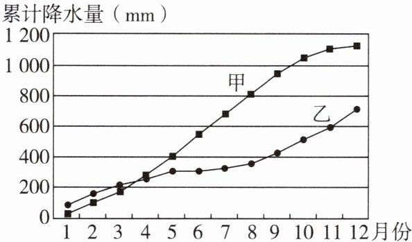 (1)甲地夏季各月降水量增长快,夏季降水量大,夏季多雨;乙地冬季各月降水量增长快,冬季降水量大,冬季多雨。