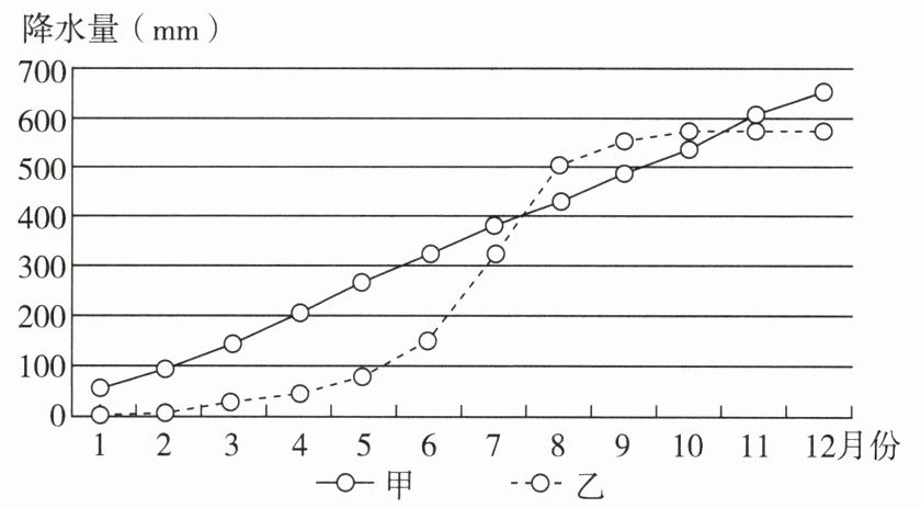 (2024·宁波高二上期末)甲、乙两城市位于欧亚大陆东西两岸,纬度相近,同属于温带气候,但降水差异明显。如图所示为甲、乙两城市降水量逐月累计图。据此完成第5、6题。