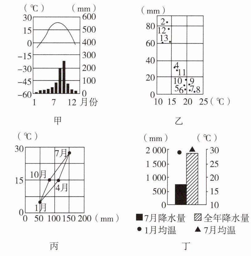 如图所示为甲、乙、丙、丁四地气候资料图。据此完成第1、2题。