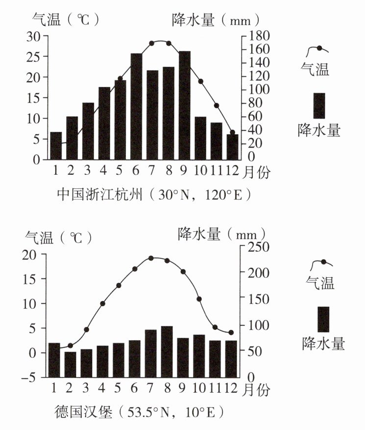 (2024·金华高二上期末)如图所示为德国港口城市汉堡和中国浙江杭州的气候资料统计图。据此完成第3、4题。
