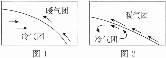 7. B 【解析】图1中冷气团主动移向暖气团,故图1为冷锋;图2中冷气团遇到暖气团时有回转运动,故图2为暖锋,B正确。