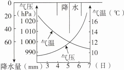 1. A 【解析】据图可知,此天气系统过境时,气温降低,气压升高,并伴有降水,可知为冷锋过境,A正确。