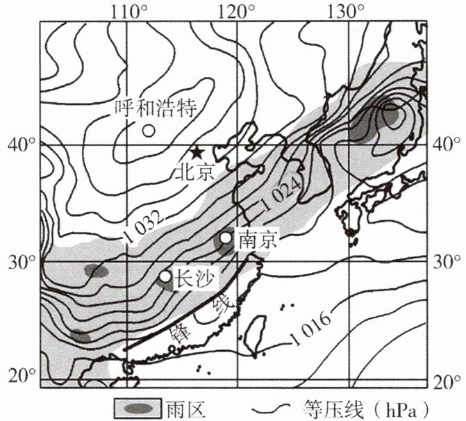 (1)判断此时南京的风向,比较呼和浩特与南京的风力大小,并说明判断理由。