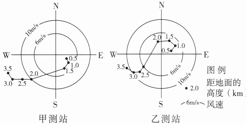 位于锋面上下的风向往往存在明显差异。如图所示为我国东部地区两测站位于冷、暖锋面下方时,自下而上垂直方向不同高度测得的风向、风速变化图。据此完成第16、17题。