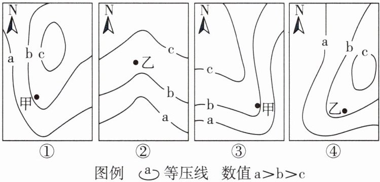 17. C 【解析】据上题分析可知,甲地为暖锋过境,乙地为冷锋过境。据图中等压线a>b>c可知,③天气系统为低压,甲地位于该天气系统东侧,可知甲地此时为暖锋过境,C正确。①天气系统为低压,甲地位于该天气系统西侧,可知甲地此时为冷锋过境,A错误。②天气系统为高压,此时乙地风和日丽,与题意不符,B错误。④天气系统为低压,但锋下为西北风,与题意不符,D错误。