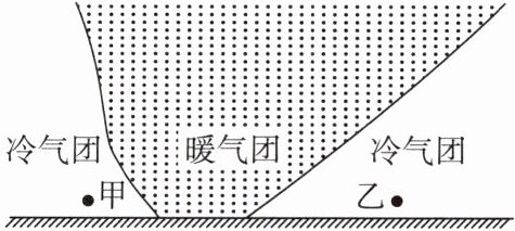 如图所示为某天气系统的垂直剖面图。其中甲($40^{\circ}N$,$110^{\circ}E$)、乙($40^{\circ}N$,$115^{\circ}E$)是近地面的两点。据此完成第5、6题。