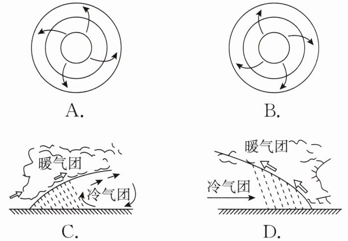 3.B【解析】造成吴地炎暑的天气系统是高气压(反气旋),北半球的反气旋呈顺时针方向辐散,B正确;图A所示为南半球的反气旋,图C所示为暖锋,图D所示为冷锋,A、C、D均错误。