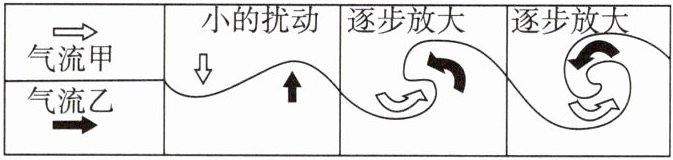 (2024·衢州高二月考)迭浪云是天空中偶然出现的特殊云结构,被誉为外观最浪漫的云。它通常短暂地出现在不稳定流动的任何高度的云层上,从最低的层云,到最高的卷云,都偶见它的踪影。上下两层不同密度气流的流速差异,导致了迭浪云的形成。如图所示为迭浪云的形成原理图。据此完成第14、15题。