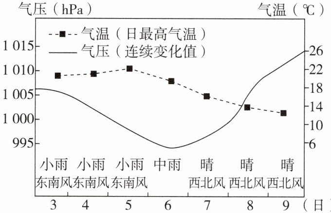 11.C【解析】该地6日无明显风向,位于气旋中心,盛行上升气流,气压最低,C正确;气流上升运动最强烈而导致近地面气压最低,此时大气降水最多是盛行上升气流产生的结果,而不是气压最低的原因,A错误;受冷气团控制会形成高压,B错误;地面辐射与6日气压最低关系不大,D错误。