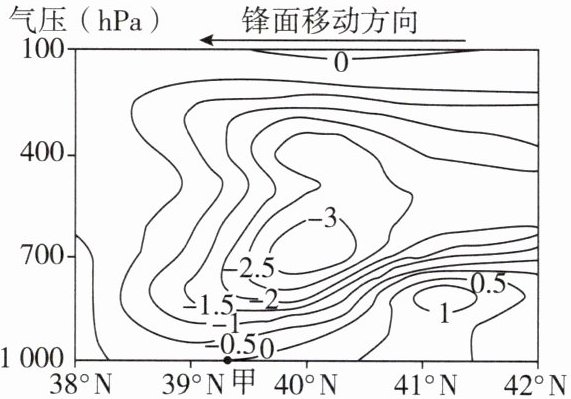 12.D【解析】据图可知,甲地以南地区大气垂直速度以负值为主,表明该地区大气以上升运动为主,应该受暖气团控制;甲地以北地区大气垂直速度逐渐出现正值,气流以下沉运动为主,应该受冷气团控制。结合锋面移动方向可知,甲地北侧冷气团向南侧的暖气团移动,形成冷锋,A、C错误。甲地附近大气的垂直速度等值线密集,变化剧烈,表明此时甲地位于冷锋锋面附近,还未完全被冷气团控制,即冷锋正在过境,故甲地出现阴雨天气,B错误,D正确。