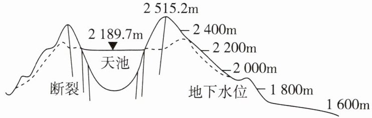 长白山天池是火山口湖,位于吉林省长白山主峰火山锥体顶部,多分布玄武岩地貌。天地区发育有多个环状、放射状断裂,大部分断裂隐于湖水水面之下。天地区多年平均气温-7.3℃,全年近200天为雨雾天气,多年平均降水量为1376.4毫米,水面蒸发量为450毫米。天地区存在缺口,湖水外泄形成长白瀑布。长白山天池最大水深373米,但水位全年变化幅度较小,丰水期与枯水期水位仅相差2米。如图所示为长白山天池剖面图。