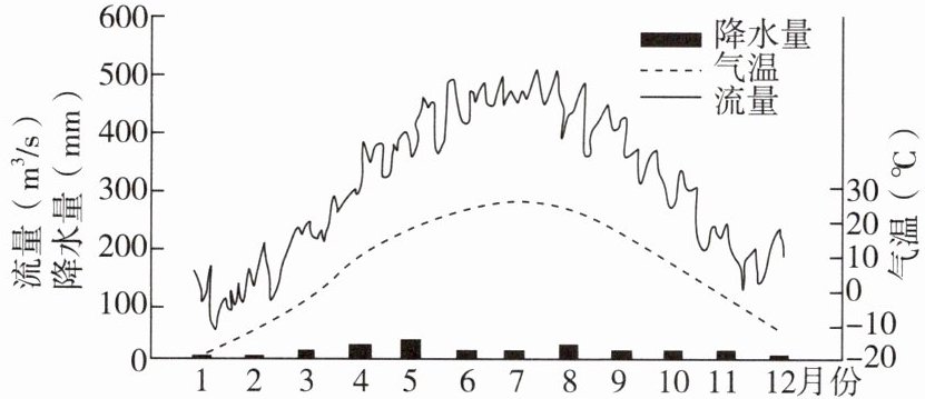(2024·温州高二期末)“尾闾”指河流的末段,在干旱地区常形成尾闾湖,此类湖泊属于内陆湖。如图所示为新疆玛纳斯河某一观测站的流量、气温和降水量变化过程图。据此完成第16、17题。