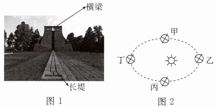 每天正午,横梁的影子会投在“长堤”上,利用它可以了解四季变化。图 2 为北半球二分二至日地球公转轨道位置示意图。